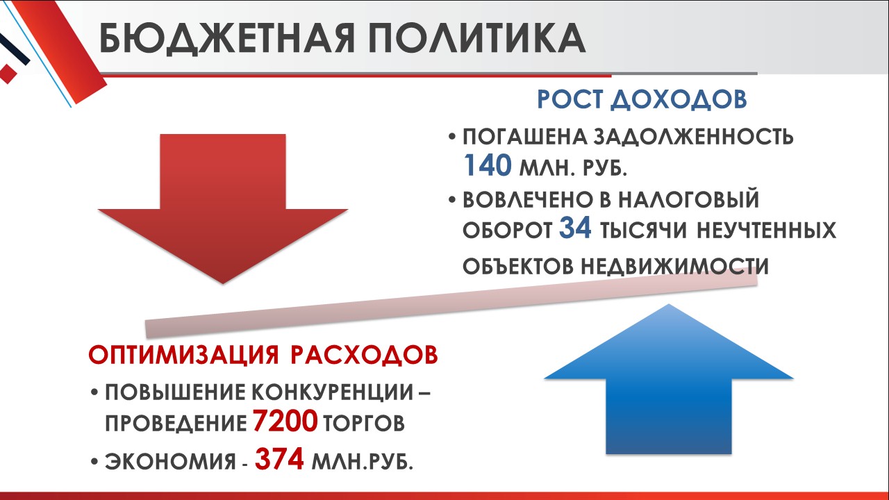 За прошлый год объем консолидированного бюджета составил 9,9 млрд. руб. – это 7 место в области среди муниципальных образований. При этом получен прирост доходной части бюджета к уровню 2017 года в размере 6 %, в том числе благодаря активной работе по мобилизации доходов. В результате которой, по итогам года было погашено более 140 млн. руб. задолженности.