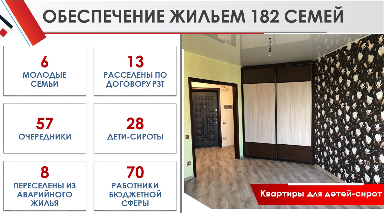В истекшем году обеспечены жильем 182 семьи, в том числе: