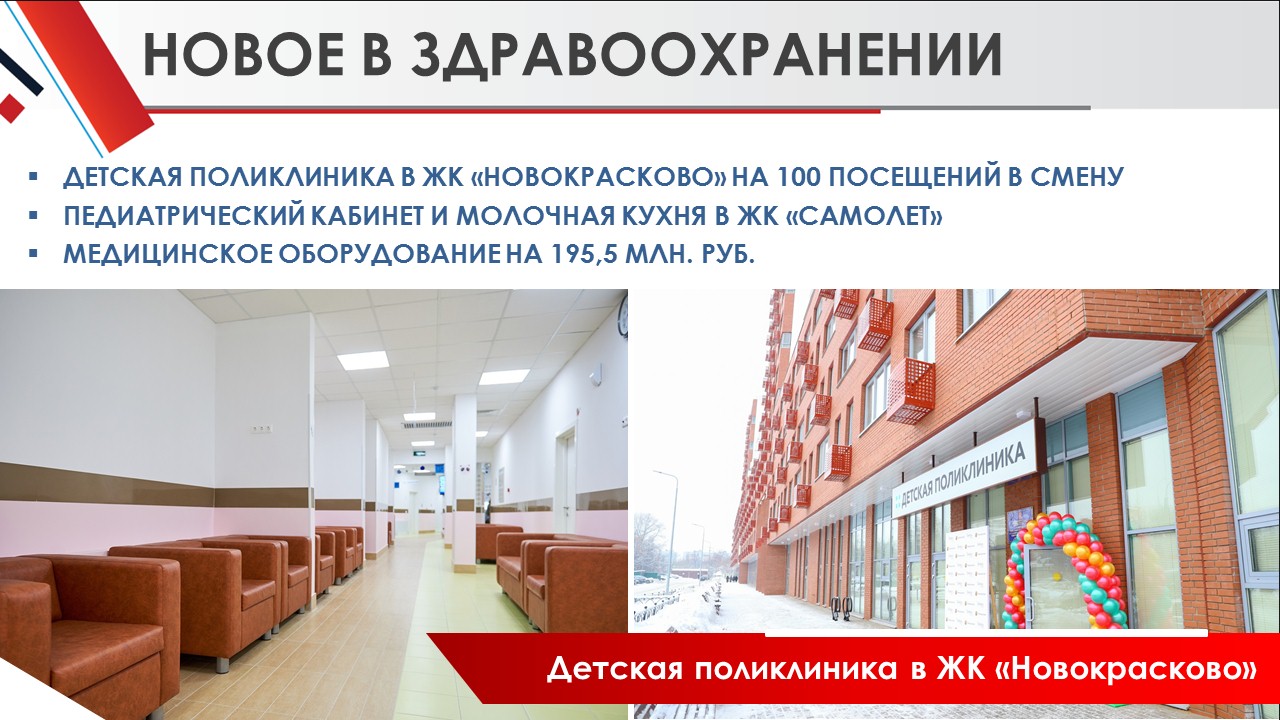 в декабре закончено строительство и оснащение оборудованием новой детской поликлиники в мкр. «Новокрасково» на 100 посещений в смену