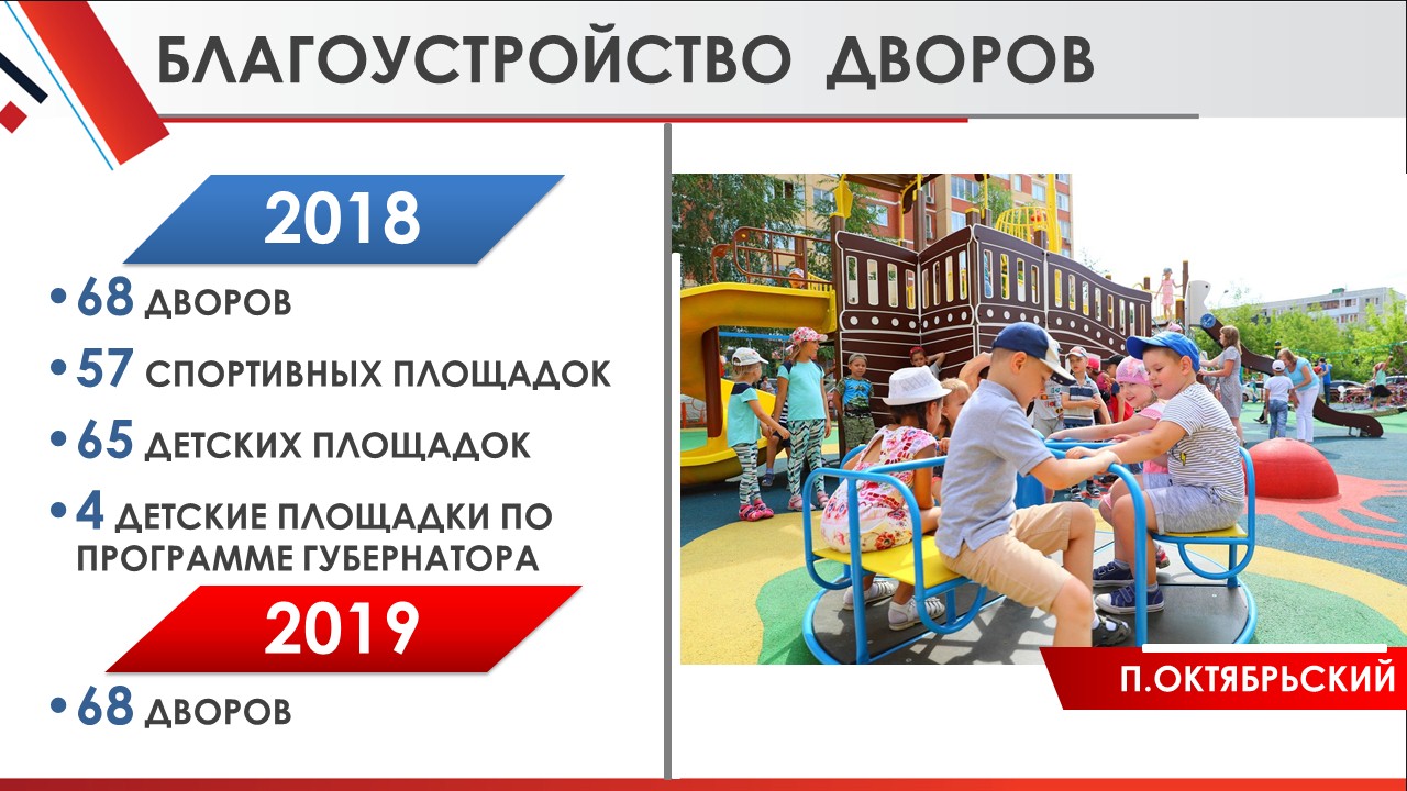 Это решение наиболее важных, востребованных жителями задач: благоустройство парков и зон отдыха, ремонт дорог, строительство новых детских садов и школ, обустройство школьных стадионов, реконструкция проблемных объектов ЖКХ и ремонты домов.