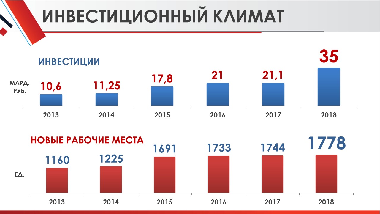 Годовой объем инвестиций – составил 35 млрд. руб. с ростом на 66 %, из них объем промышленных инвестиций составил 12 млрд. руб., с ростом 78 %.