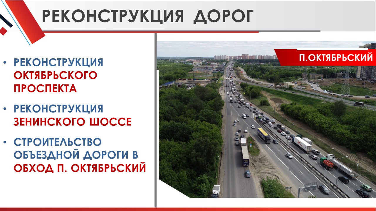 Планируется начать строительство объездной дороги в обход пос. Октябрьский. Первым этапом станут перенос коммуникаций, мост через Москва-реку и путепровод. Это колоссальный по значимости объект для Московской области, который был поддержан лично Президентом В.В.Путиным и стоит на особом контроле у нашего Губернатора А.Ю. Воробьева.