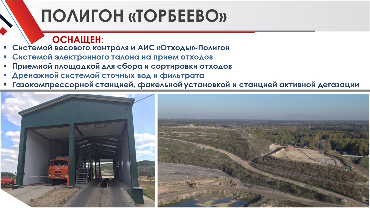 На полигоне «Торбеево» установлена автоматизированная система учета, контроля и управления размещения отходов. В ближайшее время на полигоне начнет работать система активной дегазации с выработкой «зеленой» электроэнергии для внутренних нужд.