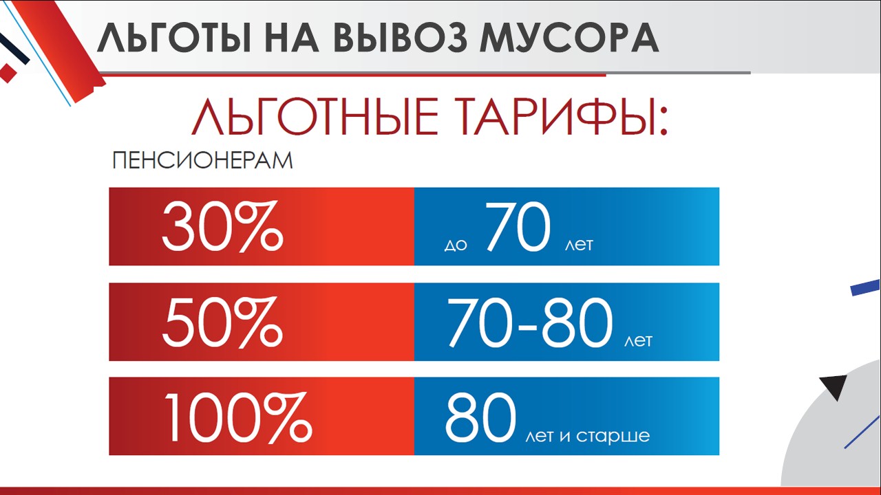 Хочу обратить ваше внимание, что Губернатором А.Ю.Воробьевым принято решение о введении на территории области льгот по оплате за вывоз мусора. Для неработающих пенсионеров до 70 лет льгота составит 30%, от 70 до 80 лет – 50%, жители старше 80 лет полностью освобождаются от оплаты.
