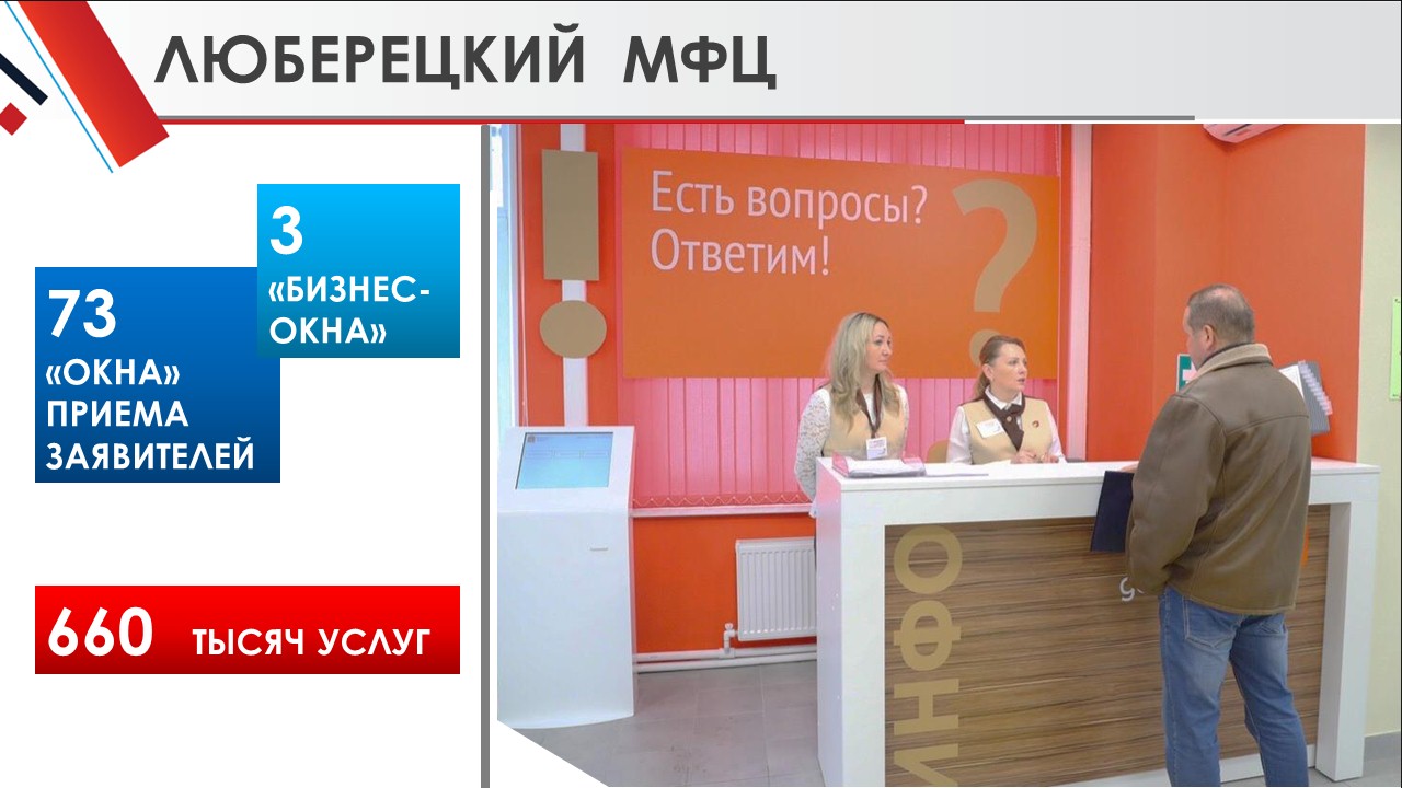 В Люберецком МФЦ сейчас работают 73 «окна» приема заявителей и 3 «бизнес-окна» для предпринимателей. В 2018 году мы открыли два новых отдела: на ул. 8 марта в городе Люберцы и в поселке Октябрьский.